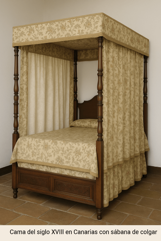 Una cama con cielo, rodapié y sábanas de colgar era un mueble opulento y muy funcional. El cielo de cama o dosel era el techo de tela que colgaba de cuatro postes, mientras que el rodapié era el faldón que cubría la base del somier. Por su parte, las sábanas de colgar eran las cortinas que pendían del dosel. En conjunto, estas tres partes no sólo demostraban su alto estatus a través de la riqueza de sus telas y bordados, sino que también cumplían una función práctica vital, creaban un espacio cerrado y aislado que protegía del frío y de las corrientes de aire.