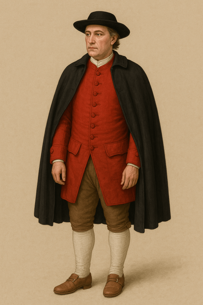 En el siglo XVIII, el capote era un abrigo o capa de uso común en la vestimenta masculina, caracterizado por ser una prenda funcional y no de lujo. Se confeccionaba con telas resistentes como la lana y su propósito principal era proteger del frío, el viento y la lluvia. Un armadón de capullo, en el contexto de la indumentaria de la época, era un chaleco acolchado, confeccionado con seda de capullo o relleno de ella, que se usaba bajo la casaca para dar forma y abrigo, se trata de una prenda interior de lujo, cuyo material de seda lo distinguía de los armadones comunes de lana, algodón o estopa. En cuanto a los “calsones de torsal”, eran un tipo de pantalones cortos hasta la rodilla, que se distinguían por un detalle decorativo, el torsal, un cordón o hilo retorcido, a menudo de seda, que se utilizaba para adornar las costuras, los bolsillos o la parte inferior de la prenda. Este tipo de adorno, convertía a los calzones en una pieza de vestir lujosa y elaborada, reflejando de esta manera la riqueza y el estatus social de Francisco.