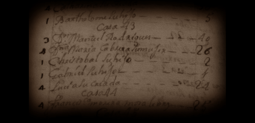 En el padrón de 1757 en la casa número uno tenemos viviendo a Don Gabriel Antonio Coello Manrique de Lara, “Alcalde actual”, de 27 años, junto a su esposa Doña Catalina Manrique de Lara, de 30 años, su criado Felipe Santiago, de 60 años y, cabe destacar, Catalina, de 50 años, esclava.
