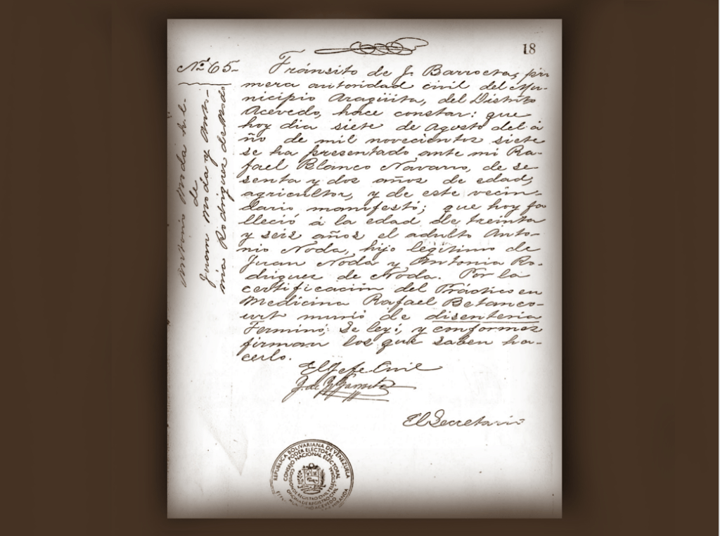 “Tránsito de J. Barroeta, primera autoridad civil del municipio Aragüita, del distrito Acevedo, hace constar: que hoy día siete de agosto del año de mil novecientos siete se ha presentado ante mí Rafael Blanco Navarro, de sesenta y dos años de edad, agricultor, y de este vecindario, manifestó que hoy falleció a la edad de treinta y seis años el adulto Antonio Noda, hijo legítimo de Juan Noda y Antonia Rodríguez de Noda. Por la certificación del práctico en medicina Rafael Betancourt, murió de disentería terminó; de ley; y conformes firmaron los que saben hacerlo.”