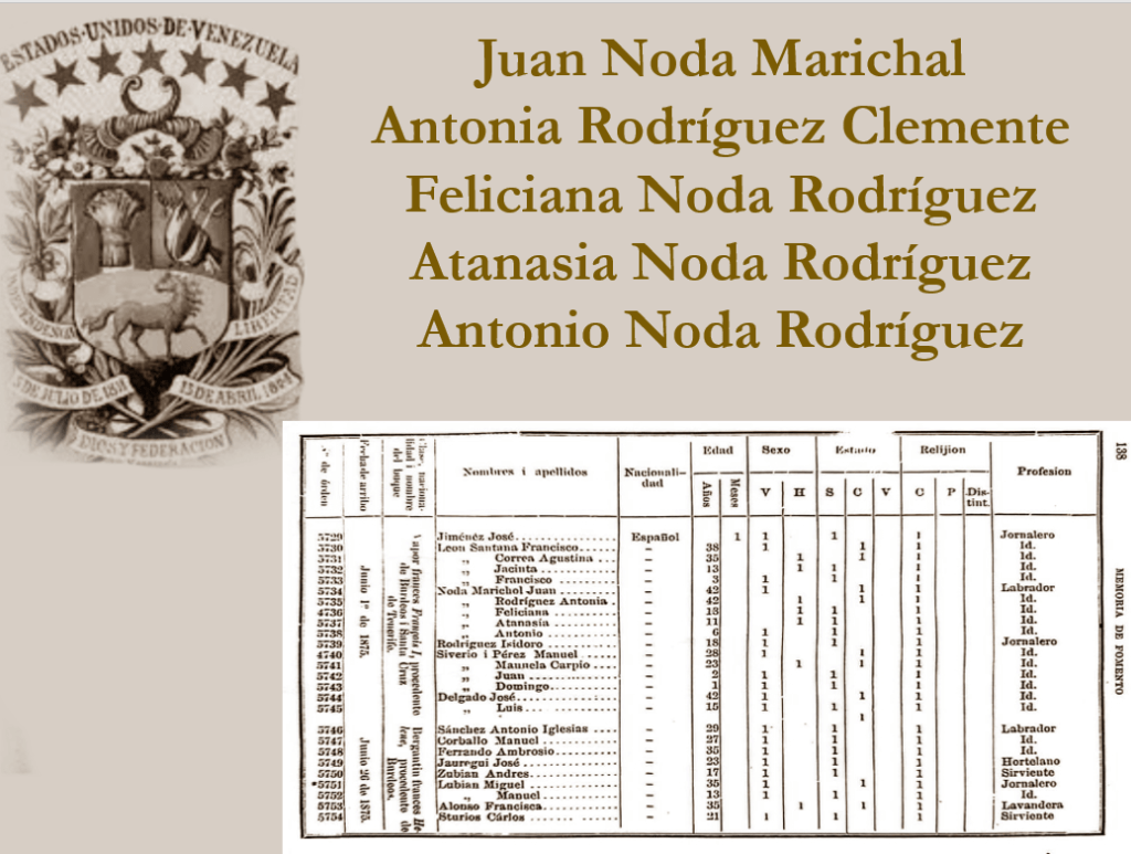 El matrimonio, ambos de 42 años, llega en unión de sus hijos, Feliciana de 13 años, Atanasia de 11 y Antonio de 6, al puerto de La Guaira, Venezuela el uno de junio de 1875 a bordo del de vapor francés François I, el buque había partido del puerto de Burdeos, haciendo escala previa en Santa Cruz de Tenerife. De la Guaira la familia se dirige a la localidad de Quebrada Seca, en Aragüita, en el estado Miranda, donde se asentaron. La investigación no obtuvo resultados positivos de la posible descendencia de Feliciana y Atanasia, quizás en un futuro algún correo electrónico abra estas dos puertas cerradas.